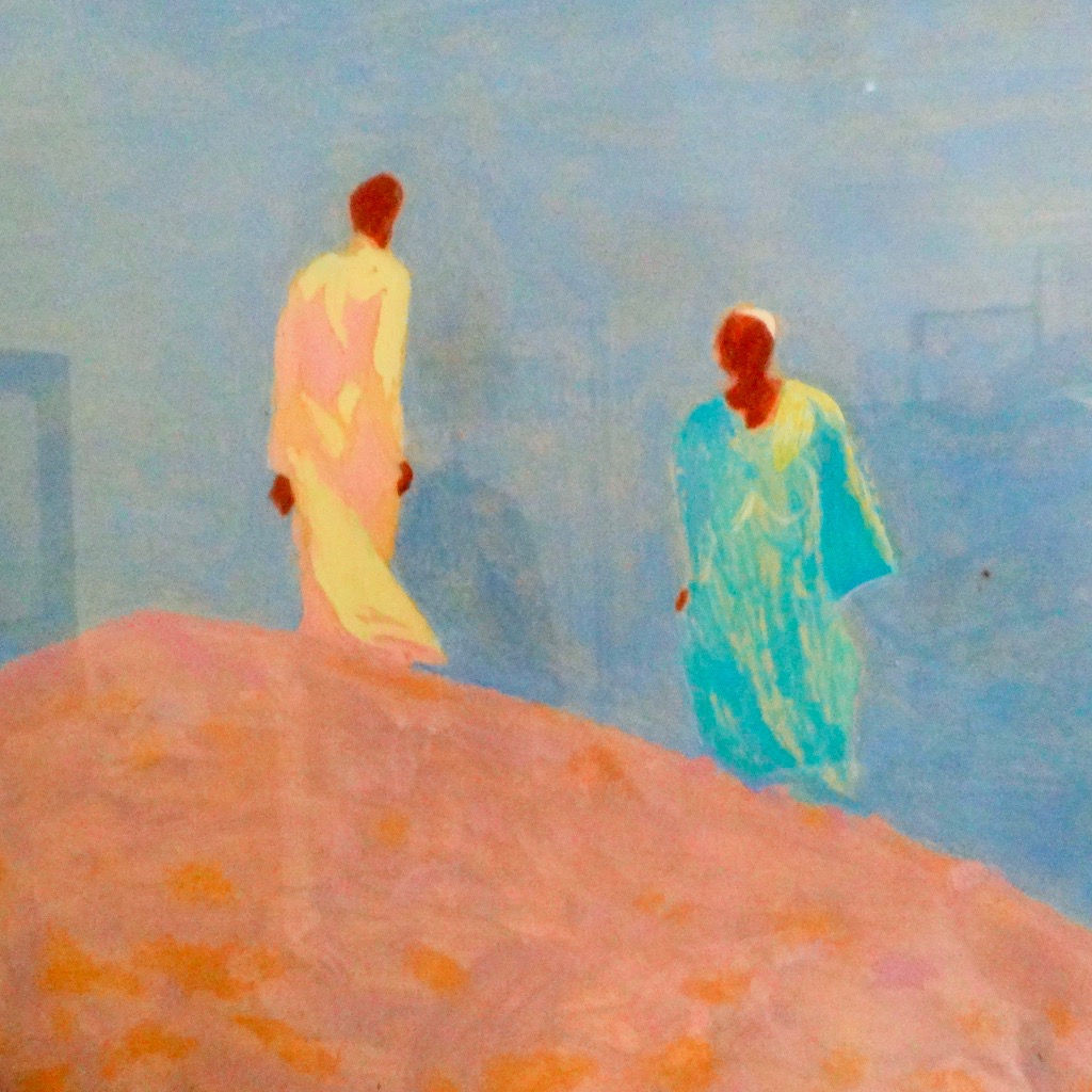 A moped scuffs along at the street, makes ineffable progress. A cart harbors cassettes, sandals, trinkets, and pairs of men. Soon they rise for tea, ablutions and prayer. Shops glow like candied fruits. Toby’s gaze settles on the sun shining colorfully in the prism of smog and sun.