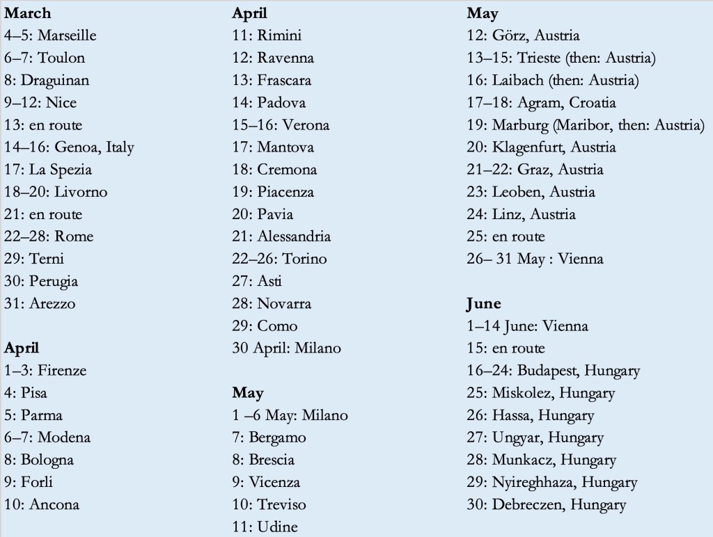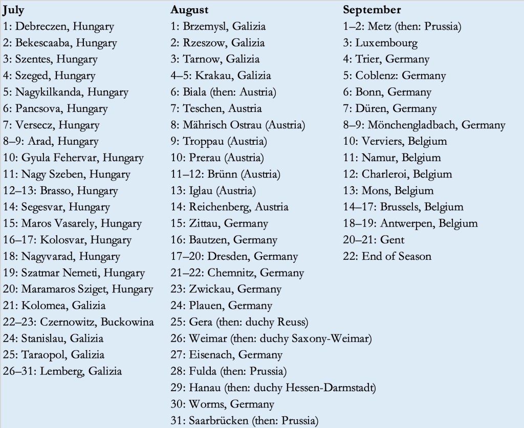 A year later, on the last European tour of 1906, they would celebrate again in Szeged, a southern Hungarian town famous for no more than salami, paprika and slippers – and the event that triggered my sleuthing – before crossing into Serbia and then turning northeast following the railroad, reaching new audiences and creating buzz.