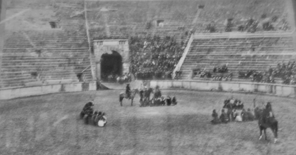 “We occupied the military field, adjoining [what] was the bull ring, one of the largest and finest we had seen, built of red brick in circular form, with a seating capacity of 12,000. It is noticeable fact that we find at these bull rings the people seem to partake of the savagery they suggest. […] The audience tore up and set fire to the benches because the management refused to kill another bull, after already killing six, the advertised number. After a bull fight the carcasses are cut up and sold to the people for food. Is it any wonder that such people are savage?”