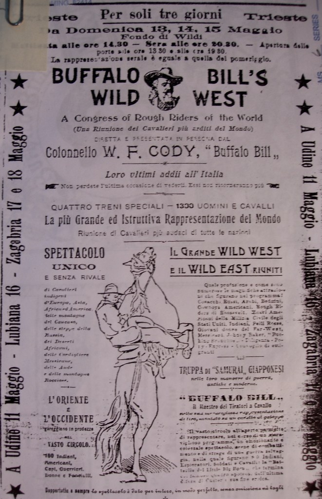 - paper also included a cowboy and bucking bronco and stressed the international aspects of the show, including a reunion of Wild West and Wild East, than the particularly American aspects. There had been some concern during the tour about the profitability of the Italian leg and this pitch was a way that was found to appeal more to Italians or other audiences less familiar with Buffalo Bill and the show. ↩︎
